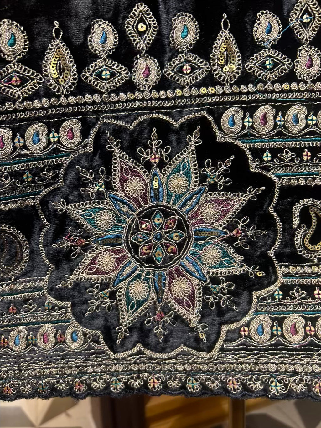 The accompanying velvet dupatta, bordered gracefully on all four sides, enhances the royal silhouette, while the pashmina bottom completes the look with unmatched comfort and sophistication. Perfect for evenings that call for warmth, grace, and an air of old-world luxury.