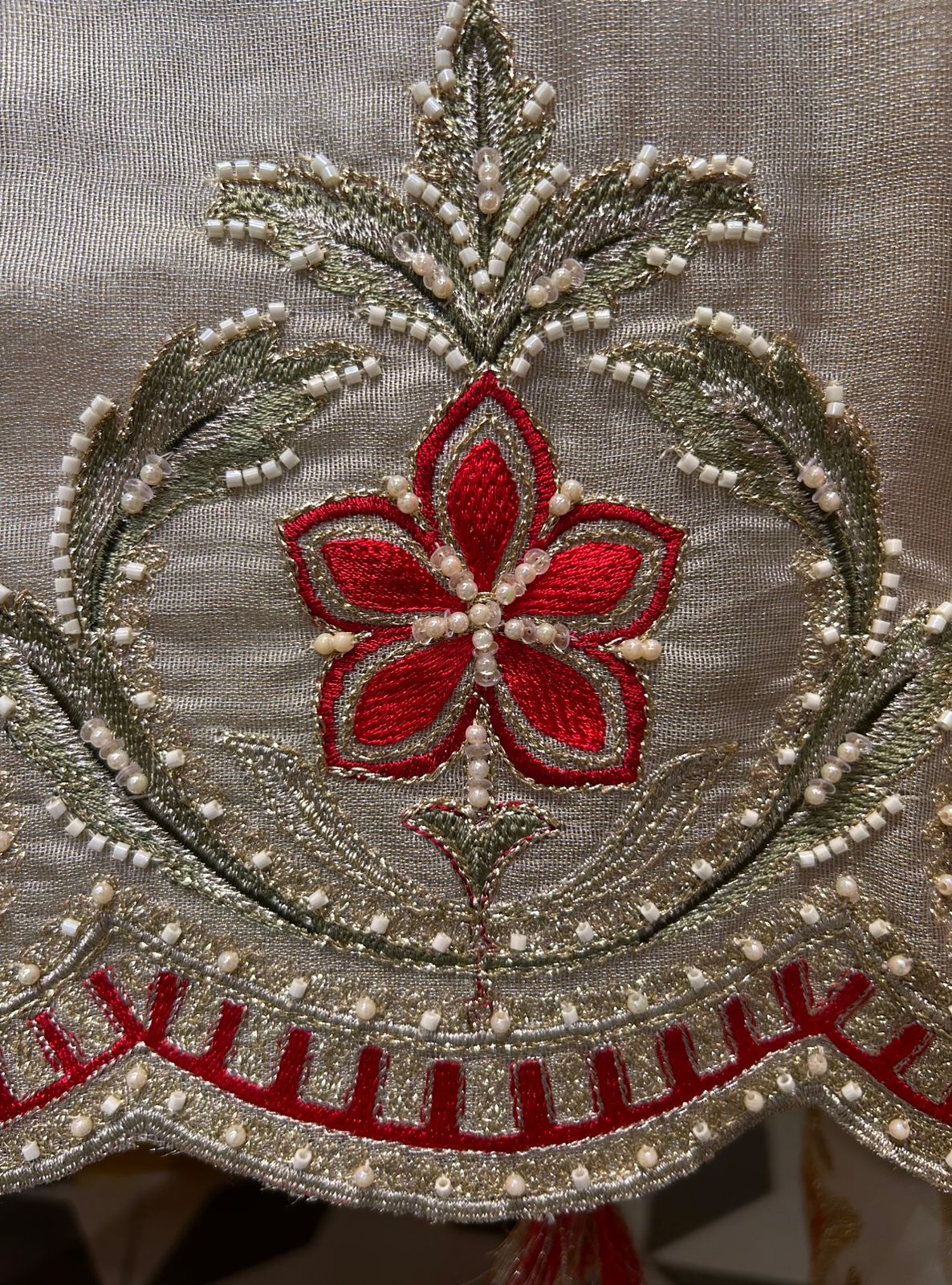 An ensemble that embodies refined elegance and timeless craft. The shimmer organza suit, detailed with thread embroidery and moti work along the neckline, exudes subtle sophistication. Paired with a silk bottom for graceful draping and a shimmer organza dupatta with a four-side border, this set is designed to radiate poise and festive charm.